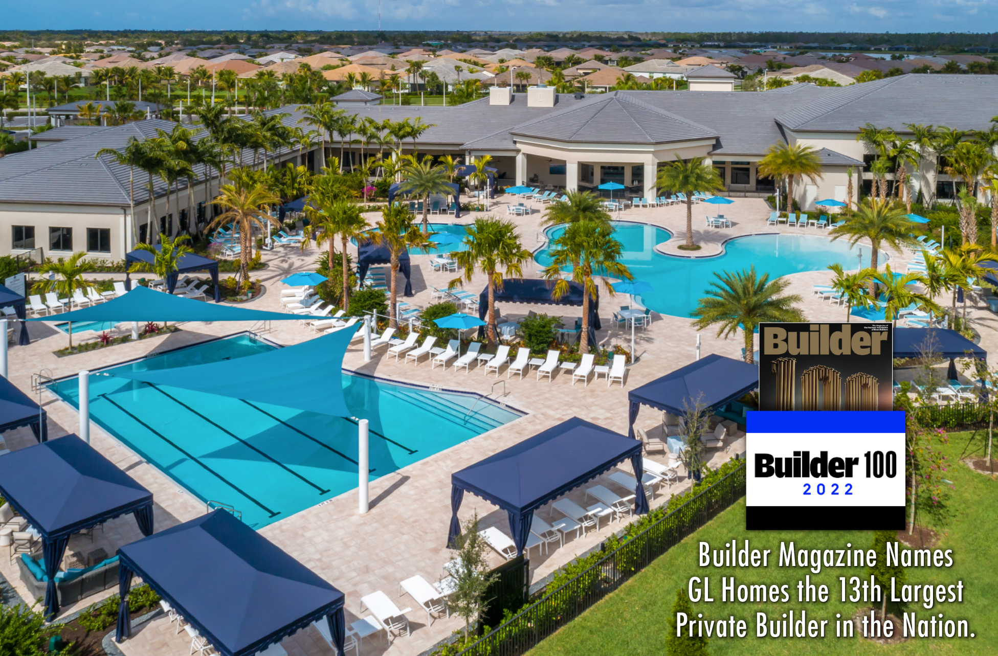 Builder Magazine has named GL Homes the 13th largest private builder in the country by revenue. The recognition was published in the recent Builder 100 issue that uses 2021 closings to rank the top 100 homebuilders nationally. Since 1976, GL Homes has grown from a small, local Florida builder to one of Florida’s largest. For over 40 years, GL Homes has created exceptional communities and built quality residences in Florida’s most desirable locations. There are more than 100,000 people living in GL homes throughout Florida – many that are second and third-time GL Homes buyers.