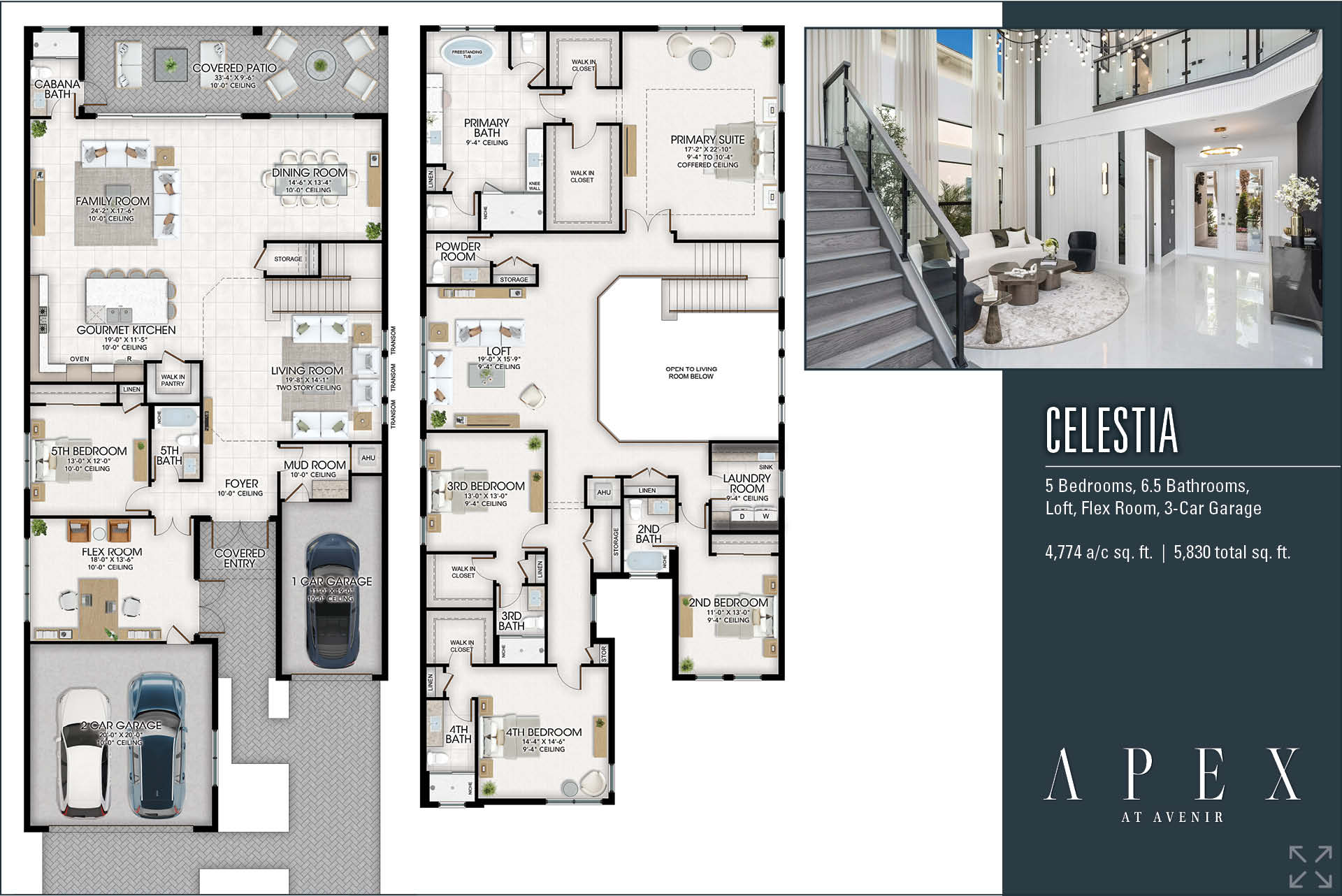 There’s a reason why Celestia is one of the most popular choices at APEX at Avenir. With nearly 5,000 sq. ft. of living space, this two-story home features soaring volume ceilings in the living room, that opens to the gourmet kitchen, family room, and dining room. Downstairs, you’ll have a flex room, perfect for a media room or home office, and a bedroom that’s a perfect private guest suite with an ensuite bathroom and a large walk-in closet. The space under the stairs is perfect for a wine cellar or additional storage. Upstairs, enjoy a spacious loft with powder bathroom, dual primary bathrooms, free-standing tub, two oversized walk-in closets in the primary retreat, convenient laundry, and three additional bedrooms, all with ensuite bathrooms. You’ll love the stunning outdoor living spaces, complete with a covered patio and a cabana bath. Every inch of Celestia is designed for luxury and wow factor!
