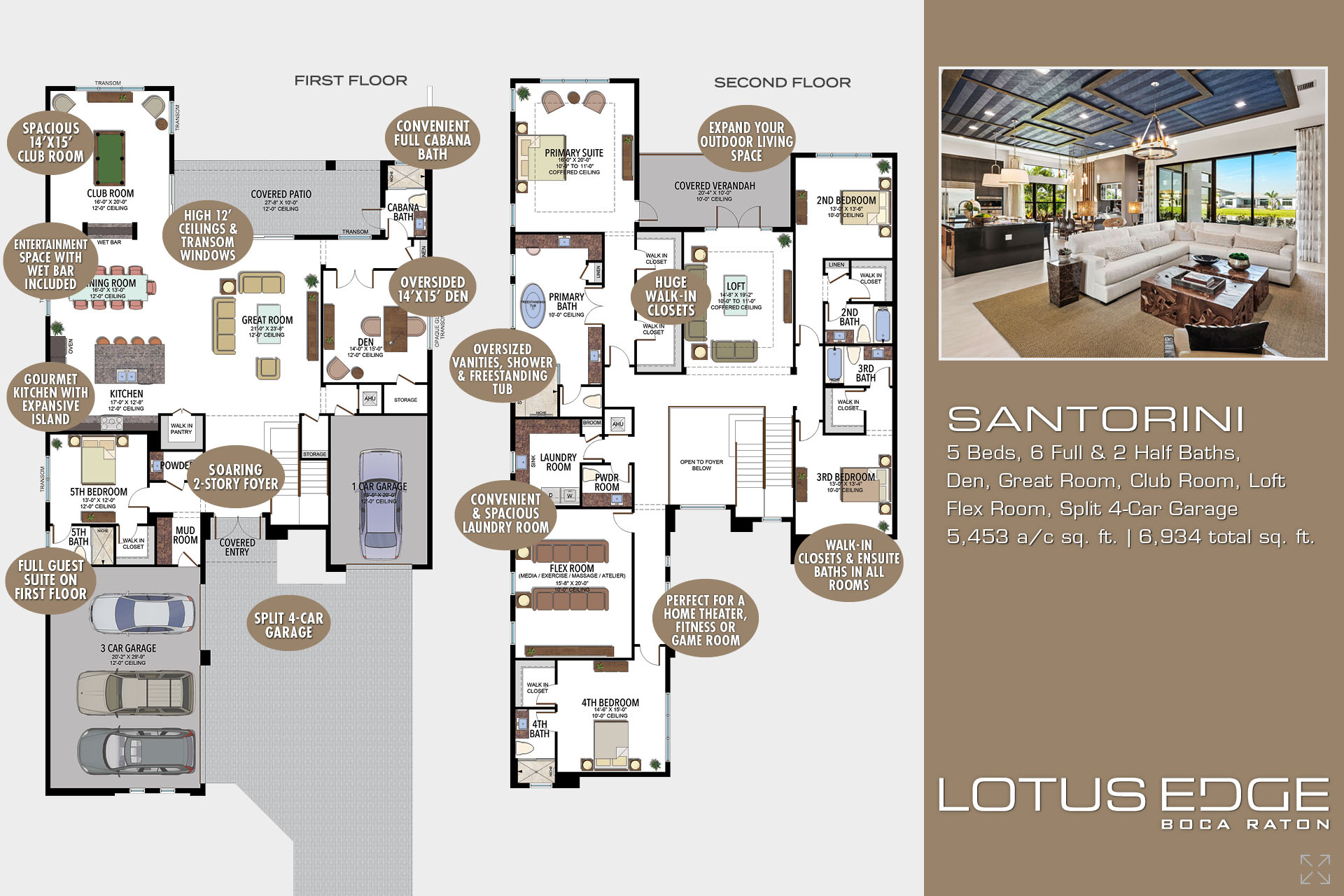 It’s easy to see why the Santorini is one of the most popular floorplans at Lotus Edge in Boca Raton. From the moment you enter, soaring two-story ceilings and expansive windows fill the home with natural light, setting the tone for over 5,400 a/c sq. ft. of open-concept luxury. The main living area features a club room with a wet bar, ideal for entertaining, and easy access to the oversized covered patio, where you can enjoy Florida living year-round. Upstairs, the primary suite feels like a private retreat with two oversized walk-in closets and a spa-like bathroom featuring a freestanding tub. Every bedroom includes a walk-in closet and en suite bath for comfort and privacy, plus a full guest suite on the first floor. The Flex Room is perfect for a home theater, fitness space, or game room, and the split 4-car garage provides plenty of storage. The gourmet kitchen features Sub-Zero and Wolf appliances as standard in the Bali Collection, creating a true chef’s workspace. Engineered wood flooring in the primary suite and loft (per plan), handcrafted wood stair railings, and refined finishes throughout complete this impressive design.