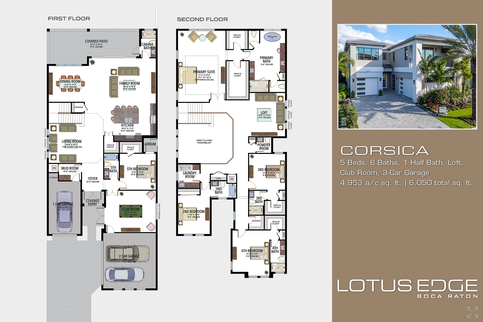 Explore the Corsica home design at Lotus Edge, a spacious two-story home offering nearly 5,000 a/c sq. ft. with 5 bedrooms, 6.5 bathrooms, loft, club room, and 3-car garage. This spacious floorplan features stunning two-story ceilings in the living room, an open-concept family room, dining room, and gourmet kitchen with stainless steel appliances. With versatile spaces like a club room, mud room, and loft, you’ll have all the room you need and the flexibility to create spaces you’ll love. The primary suite is a true retreat with two oversized closets and a spacious bathroom with a freestanding tub. Designed to impress, the Corsica has everything today’s homebuyers are looking for, plus you’ll have an incredible variety of options to choose from.
