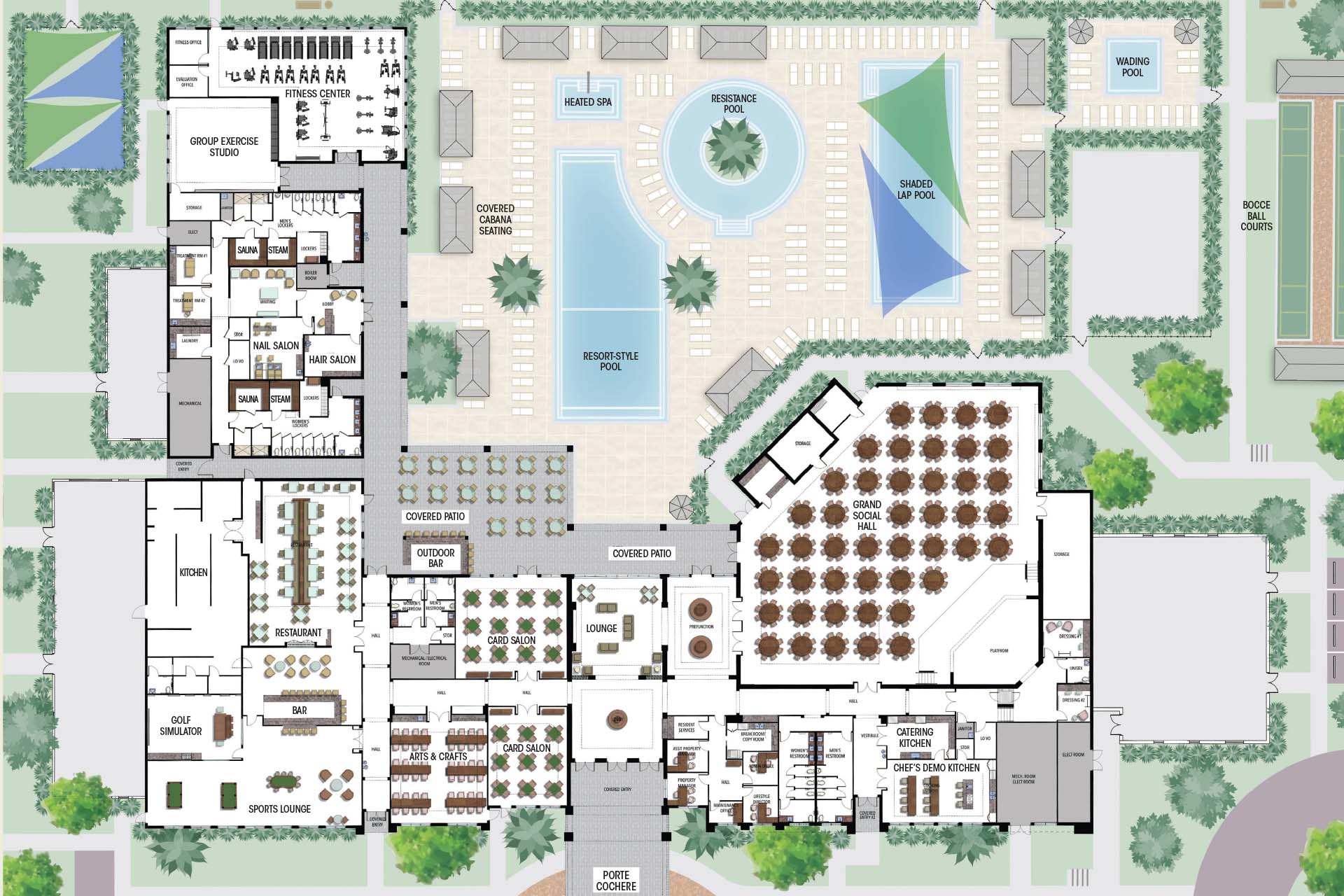 The stunning clubhouse, will span over 43,000 total square feet, and is the true centerpiece of the community. It boasts a grand social hall with a stage and dance floor, card salons, an arts & crafts center, and sophisticated dining options, including a full-service restaurant and patio bar. Stay fit in the state-of-the-art fitness center, pamper yourself at the nail and hair salon, or relax in the luxurious spa treatment rooms. For ultimate relaxation, enjoy the steam and sauna rooms, along with elegant locker rooms or catch a game at the sports lounge that comes equipped with a multi-sport simulator. There is also a shade sail covered yoga garden and group exercise studio - a favorite meeting spot for residents seeking to improve their overall health and wellness. Finally, the chef’s demonstration kitchen offers frequent classes that are often booked to capacity. A full-time lifestyle director manages all programming to ensure that events, classes and social gatherings create the ultimate 55+ lifestyle.
