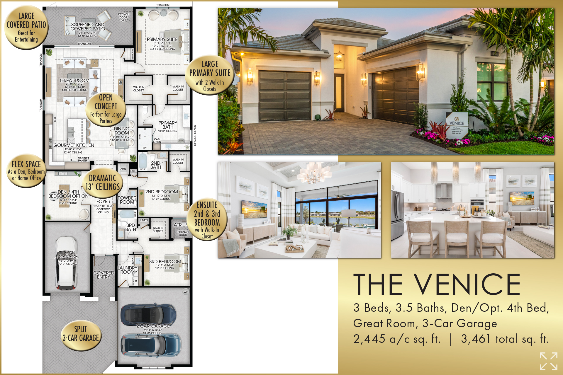 Explore the Venice and see why this floorplan is a fan favorite among homebuyers. This stunning home in the Signature Collection features 3 bedrooms, 3.5 bathrooms, den/optional 4th bedroom, great room, 3-car garage, and 2,445 a/c sq. ft. The soaring foyer welcomes you home with 14 ft. ceilings and leads into the gourmet kitchen and open concept living area, which overlooks the covered patio with 16 ft. sliding glass doors. You’ll love additional features like a spacious primary suite with two large walk-in closets and ensuite bathrooms in both secondary bedrooms, plus a split garage that offers added space and storage options.