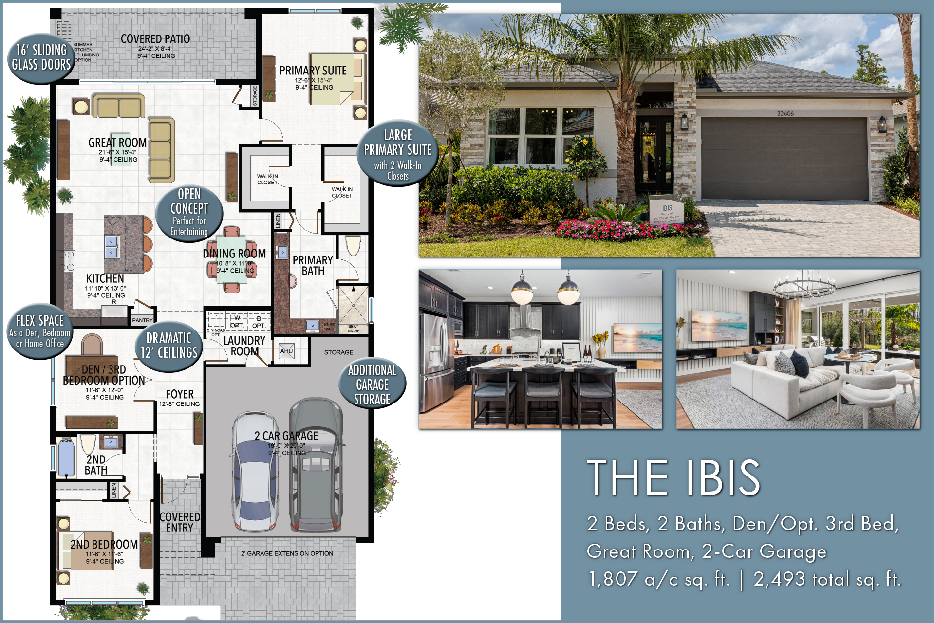Visit today and see why the Ibis in the Signature Collection is a fan favorite floorplan at Valencia Ridge. This stunning home is a huge hit among home buyers and features 2 bedrooms, plus den/optional 3rd bedroom, 2 bathrooms, great room, 2-car garage and 1,807 a/c sq. ft. A gorgeous foyer with 12 ft. ceilings welcomes you home, setting the tone for this thoughtfully created space with an open-concept design that’s perfect for entertaining. You’ll love the spacious primary suite with two oversized walk-in closets. Enjoy outdoor living and embrace the Florida lifestyle on the covered patio. With unique features and amazing value, it’s easy to see why the Ibis is so popular.
