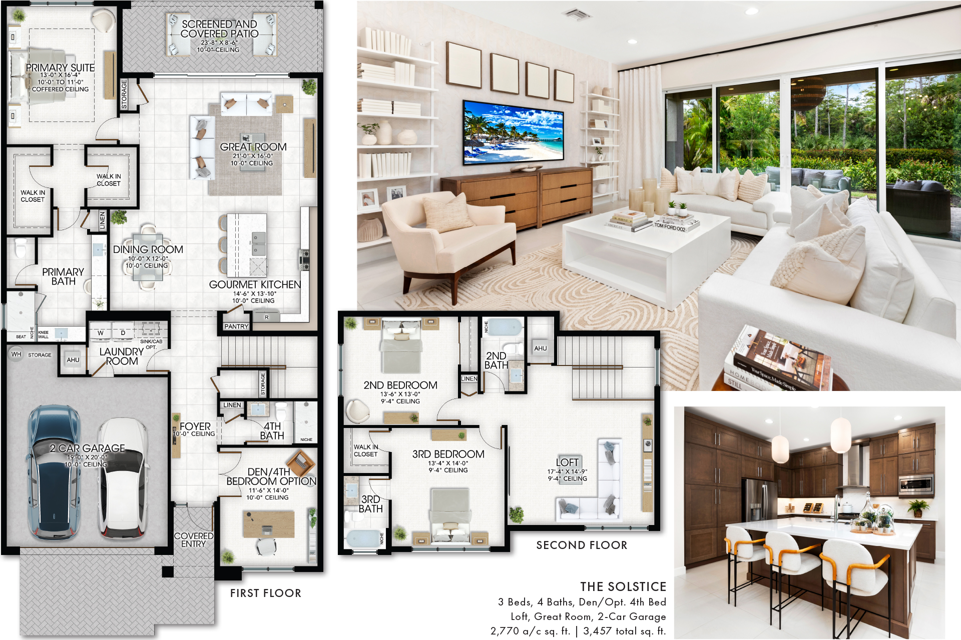 Discover affordable luxury living with one of our top-selling homes at Valencia Sky, the Solstice. Priced at an unbeatable $265 per sq. ft., this spectacular home boasts 3 bedrooms, 4 bathrooms, den/opt. 4th bedroom, an open concept living room and great room, spacious loft, and 2-car garage. Spanning 2,770 a/c sq. ft., this home provides all the space you need. You’ll love the extra space with the screened and covered patio, perfect for entertainment or relaxation. Valencia Sky also features incredible 55+ resort-style amenities in a sought-after Naples location, a stunning multi-million dollar entry with a guardhouse, and with a wide variety of luxury features included, you don’t want to miss out on the chance to call this exceptional new community home. You can also take advantage of incredible savings of $15,000 in closing costs when you choose GL Financial and Nova Title services!