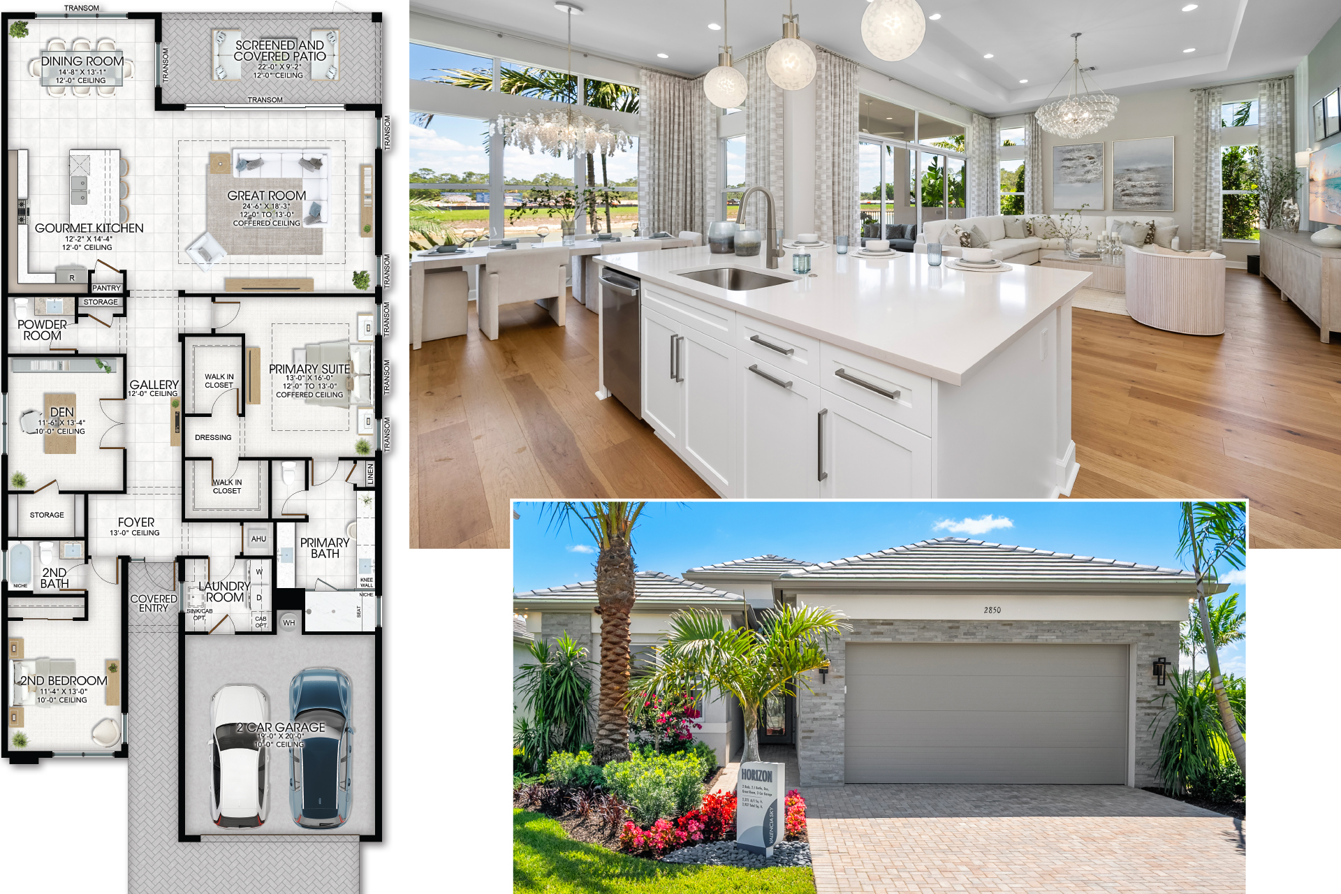 Take a look inside the stunning Horizon home design, one of two brand-new models that just opened at Valencia Sky in Naples. This home features 2 bedrooms plus a den, 2.5 bathrooms, great room, 2-car garage, and 2,273 a/c sq. ft. With soaring 12-foot ceilings, 16-foot sliding glass doors, and transom windows throughout, this thoughtfully designed home is filled with natural light and modern design. The spacious primary suite features two walk-in closets and a spa-like bathroom, while the private second bedroom offers an en suite bathroom and walk-in closet of its own. You’ll love the flexible space with the den and covered patio meant for enjoying the gorgeous Florida weather year round.